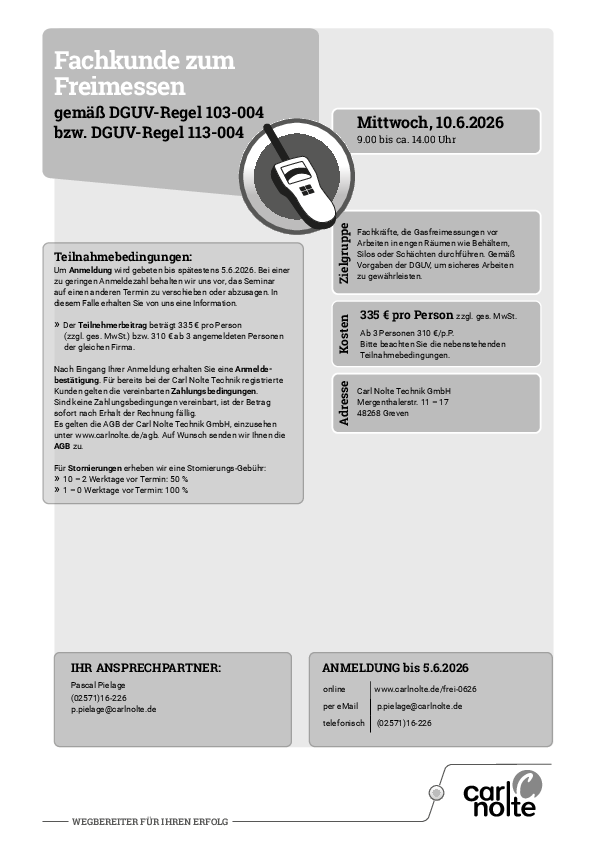 Dieser Kurs richtet sich an Fachkräfte, die Gasfreimessungen vor Arbeiten in engen Räumen durchführuen, um sicheres Arbeiten zu gewährleisten.